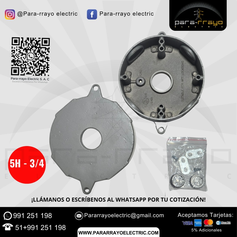 Uso: Caja redonda diseñada para instalaciones eléctricas con tuberías conduit de 3/4". Con cinco huecos (5H), esta caja proporciona un espacio adecuado para realizar conexiones eléctricas de manera segura y eficiente, facilitando la distribución y organización del cableado.