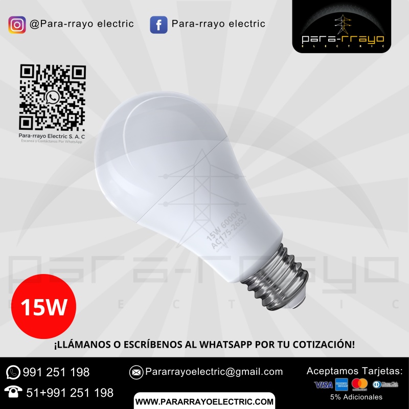 El Foco Tipo Pera 15W es una lámpara LED diseñada para ofrecer una iluminación potente y eficiente, ideal para espacios medianos a grandes. Gracias a su bajo consumo de energía y su alto rendimiento, es perfecto para quienes buscan una alternativa ecológica y duradera para iluminar hogares, oficinas o comercios.