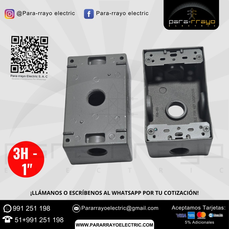 Uso: Caja rectangular diseñada para recibir conexiones eléctricas en instalaciones con tuberías conduit de 1". Está equipada con tres huecos (3H) que permiten la entrada de conductos de 1" en diferentes ángulos, ofreciendo una distribución eficiente del cableado.