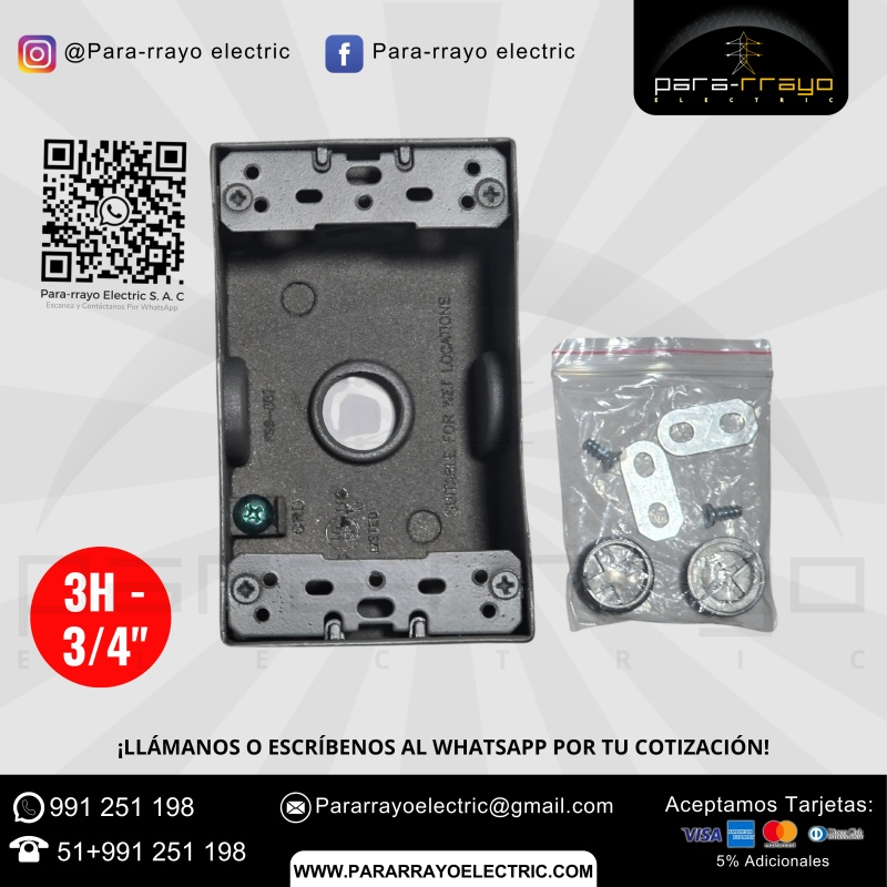 Uso: Caja rectangular diseñada para recibir conexiones eléctricas en instalaciones con tuberías conduit de 3/4". Equipado con tres huecos (3H) para permitir la entrada de conductos de 3/4", ofreciendo una distribución eficiente y segura del cableado.