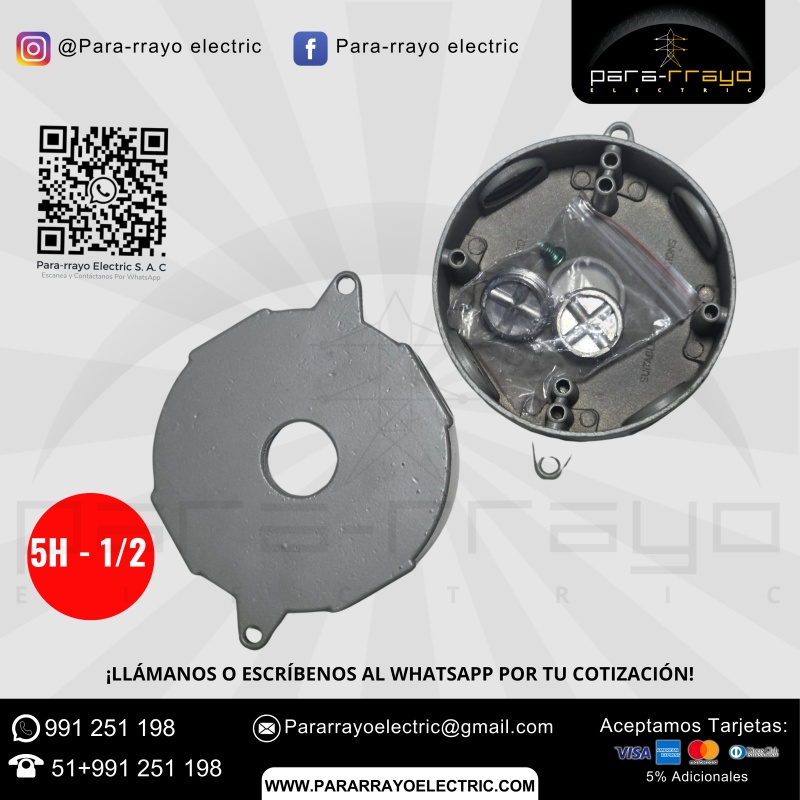 Uso: Caja redonda especialmente diseñada para instalaciones eléctricas con tuberías conduit de 1/2". Con cinco huecos (5H), esta caja permite realizar conexiones eléctricas de manera organizada y segura, facilitando la distribución y el encamado de cables.