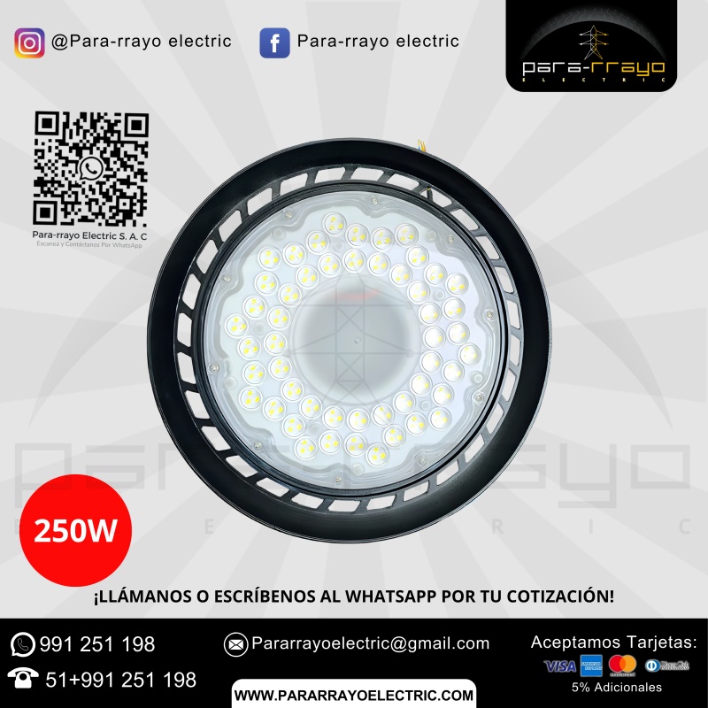 - Potencia: 250W, ideal para áreas que requieren una iluminación más intensa y un alto nivel de luminosidad.