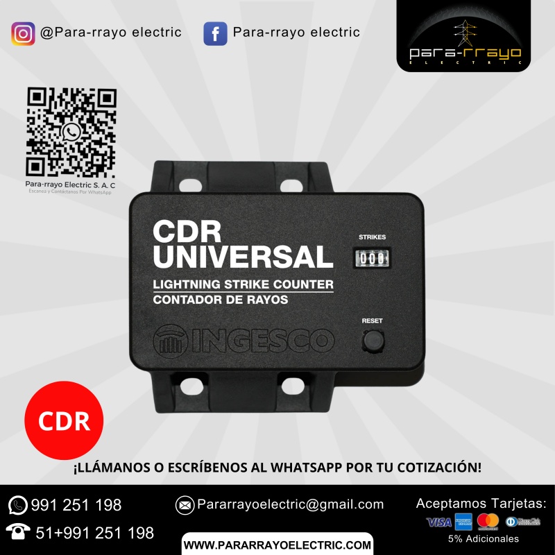 El Contador de Pararrayos INGESCO CDR Universal es un dispositivo esencial para la monitorización de descargas eléctricas en sistemas de protección contra rayos. Su función principal es registrar cada impacto de rayo recibido por el pararrayos, permitiendo un adecuado seguimiento, mantenimiento y evaluación del sistema de protección.